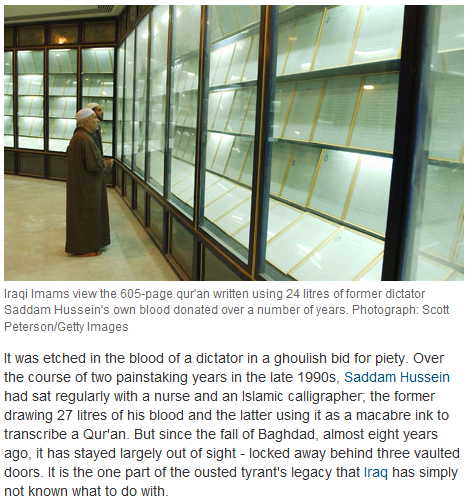 Qur’an etched in Saddam Hussein’s blood poses dilemma for Iraq leaders Full Article eBay? This entry was posted in Political, Spiritual. Bookmark the permalink.