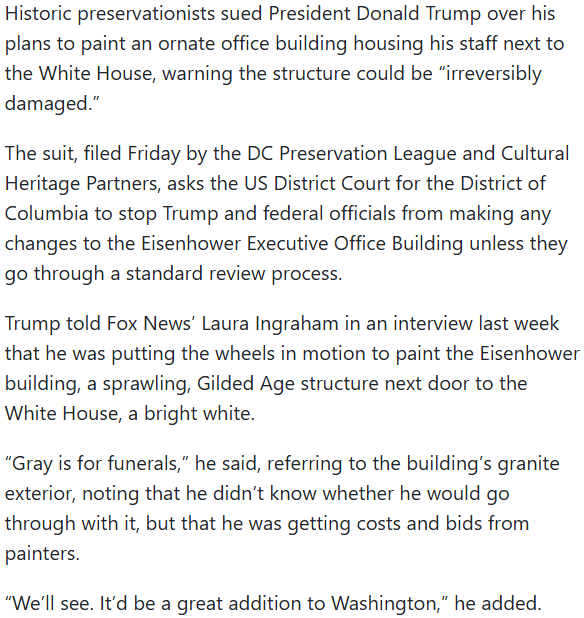 Trump now wants to paint the ornate natural granite and slate Eisenhower Executive Office Building white.