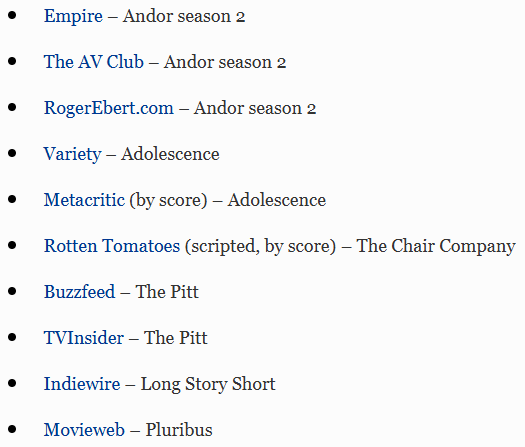 I’ve only seen Andor, Adolescence, and Pluribus. I thought Adolescence was exceptional, and the other two were also more than solid.
