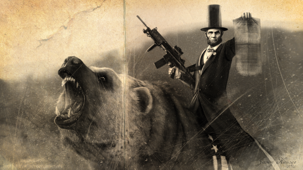 Abe Lincoln Riding a Trained Grizzly With a Machine Gun Defending Amercia