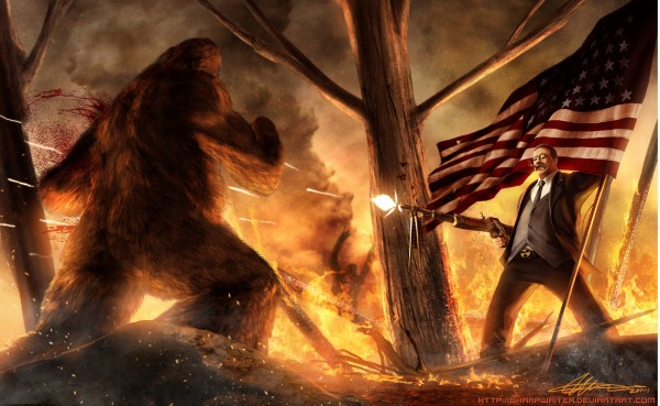 Teddy Roosevelt Defending Old Glory From Bigfoot in a Burning Forrest While Smoking a Cigar