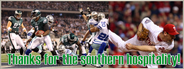- About three, maybe four years ago, I developed a friendship with a Philly sports fan. He came up with the idea of starting a friendly bet that when the Cowboys and Eagles play their first matchup of the season, the loser has to post a pic of the winner’s choosing on his blog. Somehow the Cowboys have one that first match since this bet started, but finally they lost and now I’m paying up. I thought the Cliff Lee picture was a nice touch, albeit a bit of salt to the wound. 😉