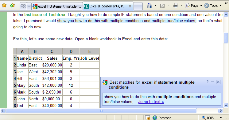 I was working on a spreadsheet the other day using IF statements when I got stuck so I decided to use the power of the the Google. I got the normal results page, but after I selected one I noticed something I haven’t seen before – in the lower right area of the page that I opened was a box from Google gave me the option of advancing to the area that best match my search. I don’t know if this is a new feature, but it’s the first I’ve seen of it. I wonder if it only works in certain browsers, I was using IE in this case.