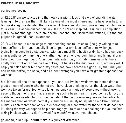 One of my friends and his wife have chosen not to drink anything but water this year and blog about it, and here’s why: