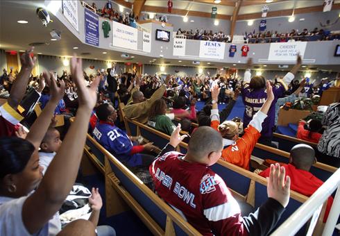 He stood in awe, looking at scores of men wearing their favorite football jerseys over their slacks and suits. In the church lobby and sanctuary, football banners and posters were plastered on the walls and hung from the rafters. Between worshipful songs of praise, the congregants broke out in a stadium wave, briefly standing and throwing their arms in the air.