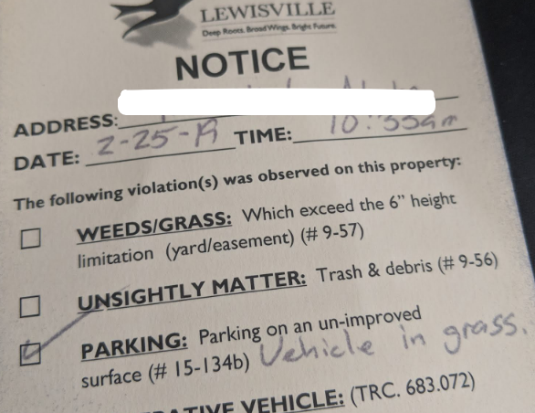Was I upset? Nah. It’s a small thing. As I said, I’ve been doing this for about fourteen years and only now have been cited, I just didn’t know I was doing something wrong. Do I think it’s a bit nitpicky of the city? Maybe a little, I understand why such ordinances exist and do recall some cars parked in the front yard of neighboring houses in Mineral Wells, and I was only partially parked on the grass on my own property. It’s just one of those things which you think you can do what you want on your own property only to find out it’s not quite that way.