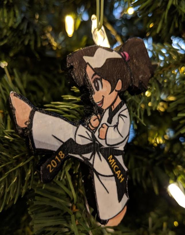 - To mark her achievement, I took one of the boards she had to break for her black belt test and made a personalized Christmas ornament out of it by carving, painting, and matting. She seemed to appreciate it, and I hope it’s something which hangs on her tree with her future family after I’m no longer part of this earth.