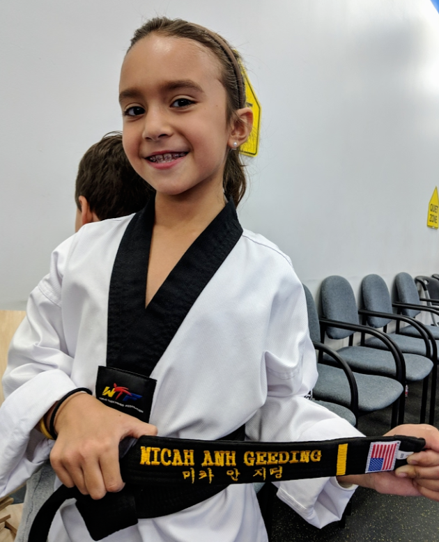 - It took her three years, but DaughterGeeding earned her black belt in Taekwondo. I know some of you think these things are trivial and just a way for adults to make money off of parents. Even if that’s the case, along the way, she picked up some confidence and discipline and learned how to set an achieve a long-term goal (this one took over a third of her life). Sure, she ain’t no Bruce Lee and not a fighter, this was more about form and technique. For instance, from memory, she had to perform the technique for all her previous belts – white, yellow, orange, green, blue, purple, brown, red, and black/red.