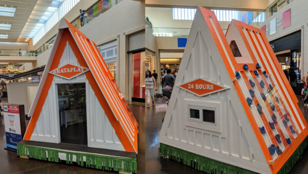 Here’s a Whataburger playhouse I spotted at Dallas’ Northpark Center. It’s part of a contest to raise fund to prevent child abuse, but I didn’t like the tagline for the promotion, “Abused Children Can’t Wait” or something close to that. When I first read it, it sounded like the children couldn’t wait to be abused.