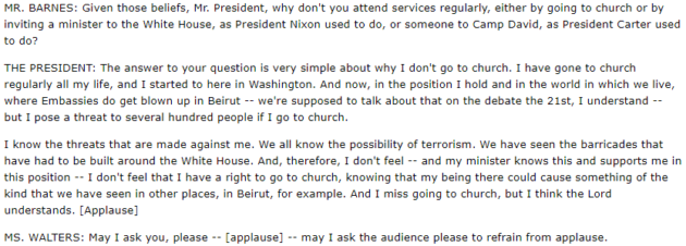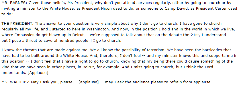 - One thing which really stood out and something I recall watching as a child was President Reagan’s answer on why he doesn’t attend church regularly as president. In short, he said he didn’t want to endanger people because he’s a constant target. I thought it was a fantastic answer and I remember the applause he received. But this time when I reviewed his answer, I noticed he didn’t entirely answer the question, which is posted below. He didn’t answer the part about why he doesn’t invite a minister over like Nixon and Carter used to do. I’m not judging Reagan here, but what I learned from this is that you don’t always have to fully answer a question to get the response you want.