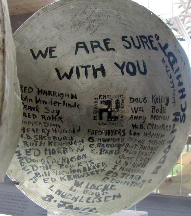- One thing led to another and I started to research Charles Lindbergh’s plane, The Spirit of Saint Lewis. I have a vivid memory of watching that Jimmy Stewart movie with my father. It amazed me that there was no windshield or any way to see straight ahead, and all the measures he took to reduce weight, like cutting the borders off on a paper map. Here’s one thing I didn’t know. A small swastika was painted on the inside of the propeller spinner, along with the names of all the employees who designed and built it. It was meant as a message of good luck before Lindbergh’s solo Atlantic crossing, as the symbol, when it faces left, was often used as a popular good luck charm with early aviators. That reminds me of a time in high school when I was in the Baker Hotel in Mineral Wells with the grandchild of one of the owners. He showed me a bathroom that had swastika tiles, which were put there before Hitler became popular. And yes, I know there’s a connection between Lindbergh and Hitler, and if Lindbergh were alive today would be campaigning to re-elect the 45th president.