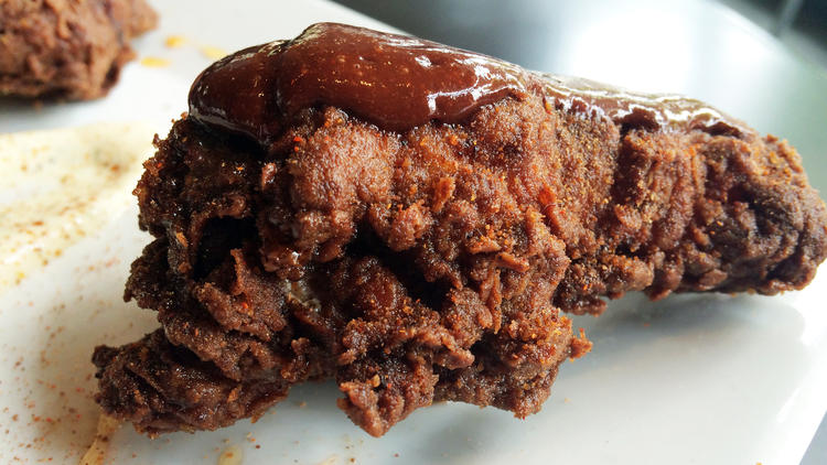 - He was craving mole and fried chicken at the same time and thought why not put chocolate and fried chicken together? The result is a chocolate fried chicken made from organic Jidori chicken soaked in a 36-hour brine, then coated in a crust with a mixture of 20 spices.